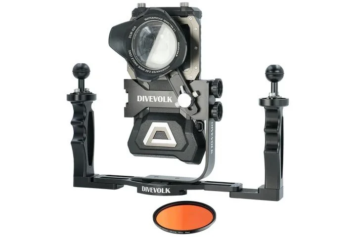 The ‘Portrait Kit’ includes a handle that facilitates shooting in portrait mode – perfect for social media creators. Source: www.divevolkdiving.com